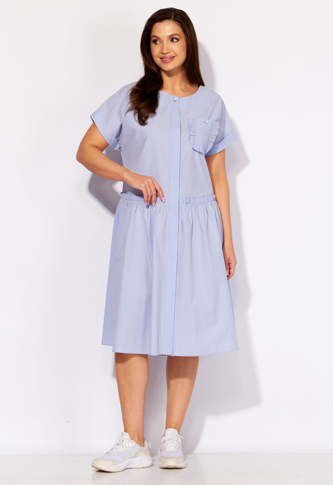 Платье женское, свободного силуэта, расширенное к низу, с коротким цельнокройным рукавом. По низу рукава манжета. Платье отрезное ниже линии талии. Нижняя часть платья со сборкой и отлетной рюшей. Вырез горловины круглой формы. Застежка центральная, на петли и пуговицы, с потайной планкой. На полочке, слева, накладной карман с рюшей и декоративной пуговицей. По лифу спинки средний шов. По низу, сзади, низ платья удлиннен.