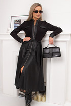 Платье женское, прямого силуэта, с втачным рукавом, длинной 3/4. Платье изготовлено из текстильной ткани с напылением и органзы с рисунком. Кокетки по переду и спинке, верхняя часть рукава и нижняя часть платья из огранзы. По боку разрез с отделочными планками. По низу рукава широкая манжета. Вырез горловины круглой формы. Застежка сзади на навесную петлю и пуговицу. Декором служит большой, съемный цветок из атласной ткани.