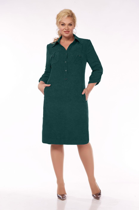 Стильное вельветовое платье А-силуэта отлично впишется в Ваш гардероб! Платье слегка расширено к низу. На переде обработаны кокетки, два накладных кармана со складками - «ножницы», два кармана c листочками, застёжка-планка на 3 петли и пуговицы. Спинка с кокеткой, средним швом, талиевыми вытачками, удлинена по отношению к переду на 2,5 см. По бокам, вдоль боковых швов, обработаны вставки, декорированные патой с полукольцом. Боковой шов с закруглёнными разрезами по низу. Рукав втачной, одношовный, внизу присобран патой. Воротник стояче-отложной со стойкой. Фурнитура может отличаться от представленной на фото. Материал хорошо тянется.