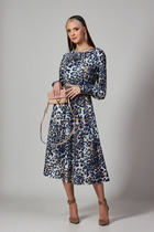 Перед с отделочной планкой горловины, нагрудными вытачками. Спинка с отделочной планкой горловины, средним швом, талиевыми вытачками, разрезом для удобства ходьбы. В боковых швах обработаны функциональные карманы. Рукав втачной, длиной ниже локтя, с манжетой и завязывающейся патой. Изделие имеет ассиметричный крой в области горловины и плеча. С левой стороны платье фиксируется на плече за счёт широкой бретели; левый рукав с вырезом и отделочной планкой. Отделкой изделия служит декоративная пряжка(может отличаться от представленной на фото). Длина платья от верхней плечевой точки спинки до низа — 105.5 см. Длина рукава в самом коротком месте — 41 см.