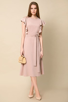 Перед платья асимметричный с наклонным подрезом, нагрудными вытачками, рельефами и двумя парами карманов (накладные и внутренние в шве рельефа). Застёжка центральная бортовая на семь петель и пуговиц. Горловина обработана рубашечным воротником. Спинка с подрезом и выходящими из него складкой и декоративной шлёвкой. В боковых швах обработаны разрезы. Рукав втачной с отрезной манжетой на пуговице, длиной 3/4. Отделкой изделия служит металлическая фурнитура (может отличаться от представленной на фото).