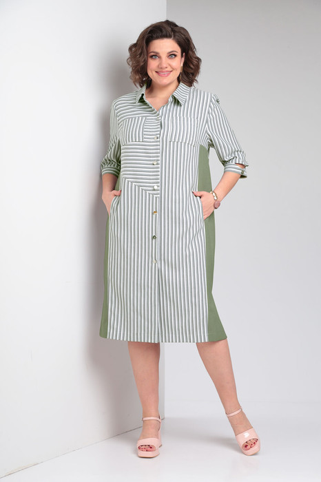 Стильное платье-рубашка прямого силуэта, выполненное из однотона и ткани в полоску. Свободный крой придает лёгкость и естественность модели.