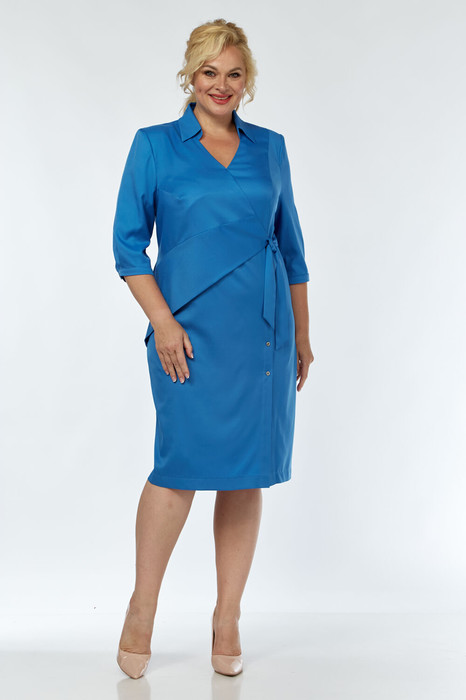 Перед платья с отлетной деталью на запах, завязывающейся на пояс; с левой стороны с рельефным швом от плеча, переходящим в декоративную шлицу с тремя пуговицами. Спинка со средним швом. Прилегание по талии можно регулировать за счёт пояса. Рукав втачной, двухшовный, длиной 3/4, с разрезом в локтевом шве, по низу с заложенными складками и манжетой на пуговице. Вырез горловины V-образный. Воротник стояче-отложной со стойкой.