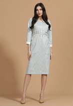 Платье женское полуприлегающего силуэта,со спущенным плечом. Перед цельный с планкой на петли-пуговицы до талии. По переду расположены накладные карманы в области груди и в области бедер. Горловина округлой фомы, в боковых швах расположены разрезы. К платью прилагается ремень.