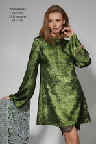 Стильное платье А-силуэта, выполненное из вискозы с оригинальным принтом. Платье отрезное по линии талии. Верхняя часть переда платья с круглой горловиной, спинка - со средним швом и капелькой, застегивающейся на навесную петлю и пуговицу. Рукав цельнокроенный, длиной 7/8. Нижняя часть платья покроя полусолнце. На одной из сторон юбки переда обработана отделочная планка с декоративными пуговицами, внизу - разрез. В боковых швах в области бедер обработаны карманы. В центральной части переда в области талии - притачной пояс со съемной декоративной цепью, которая изящно подчеркивает линию талии. По боковым швам и спинке пояса вставлена широкая резинка.