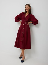 Платье полуприлегающего силуэта, длиной миди, выполненное из поливискозного трикотажного полотна. Перед с нагрудными вытачками и фигурным v-образным вырезом горловины. Горловина декорирована  горизонтальным элементом из основной ткани и декоративной  съёмной цепью. Спинка со средним швом, в котором обработана потайная молния. Рукав втачной одношовный длиной 3/4.