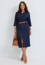Элегантное платье полуприлегающего силуэта с асимметричной застежкой на петли и пуговицы. Перед платья с нагрудными вытачками и клапанами в области бёдер. Спинка с талиевыми вытачками и средним швом, внизу которого обработана шлица. Застежка асимметричная, двубортная, по низу платья расходится на разрез. В области плеч — погоны, закрепляющиеся на пуговицу. Рукава двухшовные втачные, длиной 3/4, с притачной манжетой. Платье с плечевыми накладками и со съёмным ремнем в цвет фурнитуры. Фурнитура и комплектующие (ремень) могут незначительно отличаться от представленных на фото.