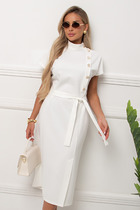 Стильное,элегантное платье прямого силуэта из трикотажного полотна. Короткий цельнокроеный рукав. Горловина оформлена воротником -стойка переходящая в планку с застежкой на петли и пуговицы. Модель отрезная по линии талии. Низ ровный,по переду шлица. Пояс из основной ткани в комплекте.