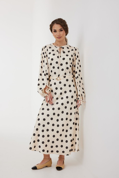 Лиф с переходящим плечевым швом на перед, нагрудными вытачками, по спинке - с талиевыми вытачками, по плечевым швам небольшая сборка, по переду средний шов, горловина окантована бейкой, переходящей в завязки. Длина платья ниже колена.