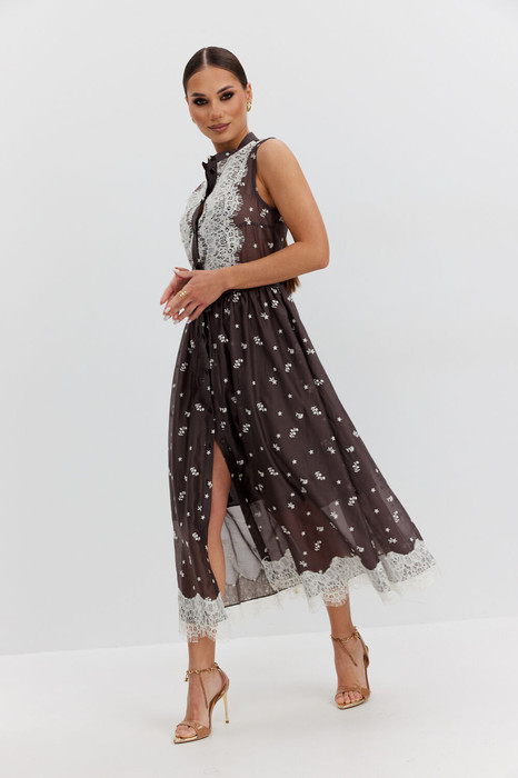 Платье женское полуприлегающего силуэта, отрезное по линии талии, юбка косого кроя, на подкладке, расширенная книзу. Лиф платья без подкладки, по переду с кружевной вставкой. Воротник – невысокая стойка. Застежка на планку с петлями и пуговицами. По талии кулиса и пояс-шнурок, завязывающийся спереди. Низ платья украшен кружевом. Длина 130 см.