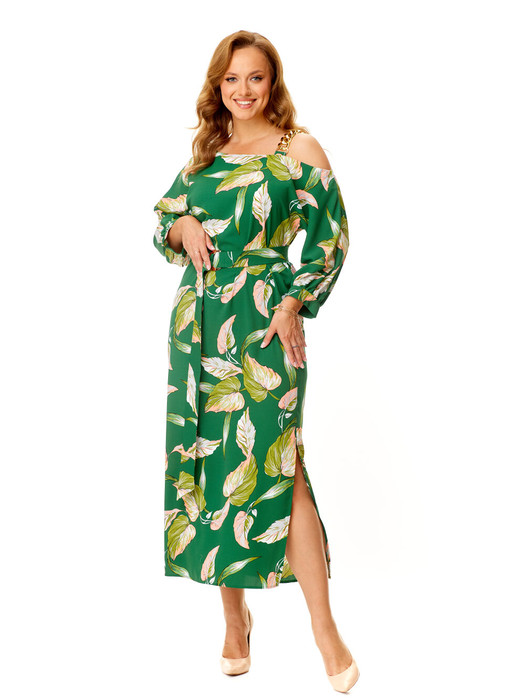 Горловина ассимертричная округлой формы с декоративной цепью на левом плече.