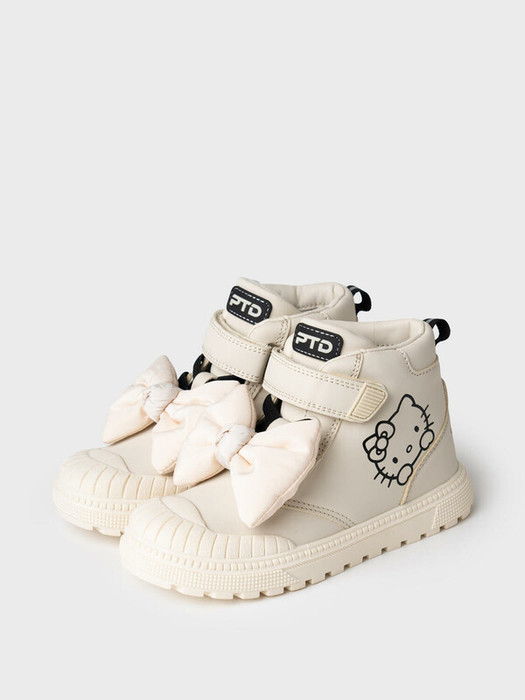 Стильные ботинки для девочки с HELLO KITTY. Модель выполнена из искусственной кожи с большим  объемным бантом спереди. Подкладка и съемная стелька выполнены из мягкого флиса. Модель имеет светоотражающие элементы. Формоустойчивый задник поддерживает стопу в правильном положении. Эргономичная форма колодки обеспечивает правильное формирование стопы ребенка. Модель имеет резиновые шнурки и липучку для удобства обувания. Подошва с защитой носочной частью из облегченной терморезины не скользит и устойчива к истиранию. Рекомендованный температурный режим носки от +10°С до 0°С".
