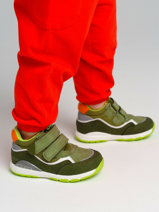 Кроссовки из искусственной кожи и текстиля. Подкладка выполнена из 100% хлопка. Две липучки создают удобство при обувании. Съемная кожаная профилированная стелька с анатомической формой способствует равномерному распределению давления и препятствует развитию плоскостопия. В модели использованы BIO-FLEX технологии для правильного формирования стопы ребенка:  стабилизация, дышащий антибактериальный материал для стельки. Гибкая подошва с противоскользящим эффектом. ANTI-SHOCK система снижает ударную нагрузку.