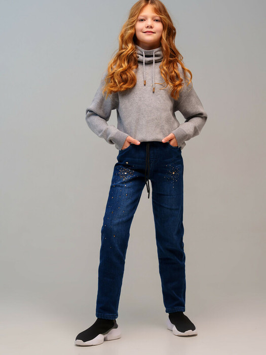 Джинсы с флисом для девочки подростка. Модные утепленные джинсы regular fit (классическая посадка)  на резинке со шнурком. Боковые карманы. Модель из капсульной коллекции PREPPY VIBE (ПРЕППИ ВАЙБ). Соберите полный образ в едином стиле!