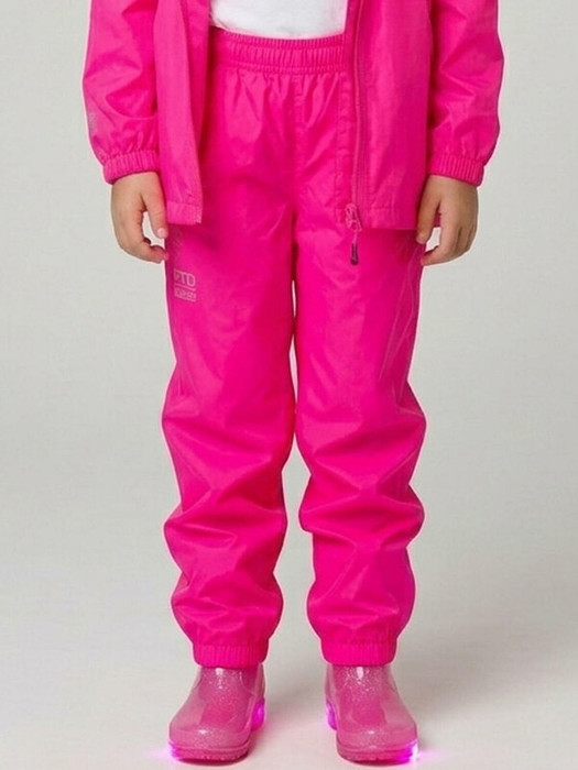 Яркие непромокаемые и ветронепродуваемые легкие брюки для девочки из PTD RAIN COLLECTION. Брюки одевается на верхнюю одежду, поэтому  в брюках есть специальные  отверстия, чтобы была возможность залезть в карман верхней одежды. Брюки на широкой резинке.  Манжеты на резинке и кнопке, которую можно расстегнуть , чтобы брюки  можно было одеть сверху на резиновые сапоги.  Специальная грязеотталкивающая пропитка сохранит изделие чистым даже после активных игр на улице.  Внутри все швы дополнительно проклеены изолирующей тесьмой. Светоотражающие детали обеспечивают безопасность ребенка  в темное время суток.  В комплекте идет непромокаемый мешочек. Брюки в свернутом виде и упакованные в мешочек занимает очень мало места. поэтому их легко можно брать с собой  в рюкзак или сумку на случай дождя. Брюки можно сочитать с непроницаемыми курткой из такого же материала