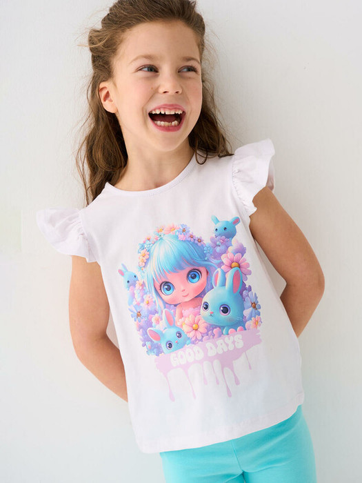 Детская футболка для девочки. Модель прямого кроя, выполнена из эластичного хлопкового трикотажа джерси. Спереди расположен крупный красочный принт. Горловина круглая. Рукава-крылышки.