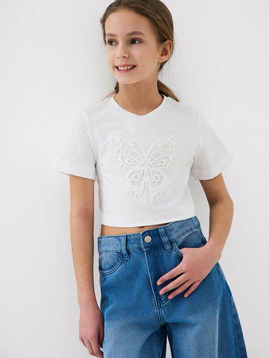 Футболка оверсайз для девочки подростка. Модель укороченная, выполнена из эластичного хлопкового трикотажа джерси. На груди расположена вышивка с бабочкой. Горловина круглая.