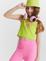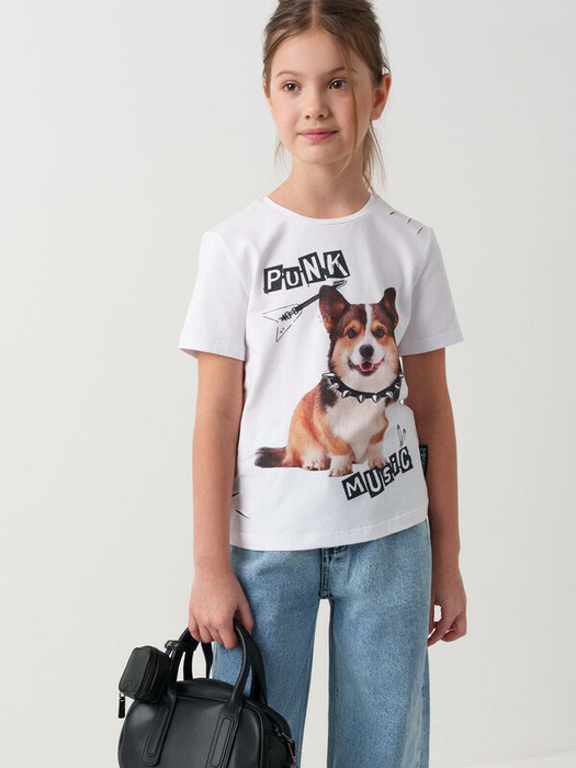 Футболка для девочки подростка. Модель выполнена из эластичного хлопкового трикотажа джерси. На груди расположен крупный принт с изображением собаки. Горловина круглая. Дополнительные элементы дизайна — декоративные разрезы и боковая лента с логотипом бренда.