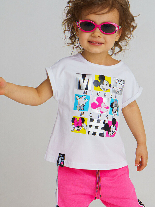 Футболка с принтом Disney из качественного приятного на ощупь трикотажа. Размер изделия на фото - 86, рост модели 86 см. Высокое содержание хлопка 95%. Благодаря наличию эластана в составе ткани, изделие проще в уходе и держит форму. Кнопки на плече.