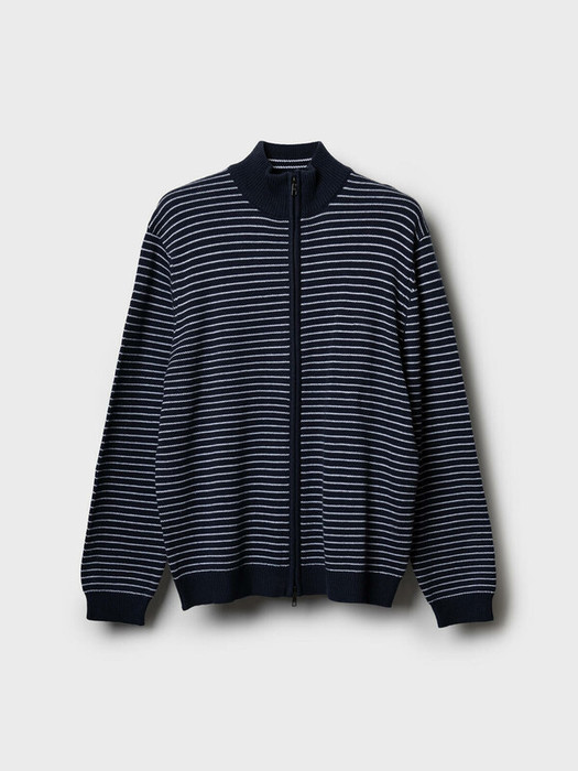 Мужской кардиган. Модель прямого кроя с застежкой на молнию. Выполнен из вязаного трикотажа. У кардигана высокий воротник-стойка. Воротник украшен контрастными полосками. Удобная двухзамковая молния позволяет регулировать посадку.