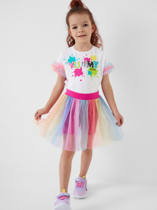 Яркий детский трикотажный комплект для девочки. Состоит из футболки и юбки-шорт. Футболка прямого кроя, с короткими рукавами украшена эффектным принтом. Главный акцент — объемные рукава с многослойными воланами из легкой сетки. Юбка-шорты выполнена в том же стиле: сверху — пышная сетчатая юбка с градиентным принтом, снизу — удобные трикотажные шорты. Пояс на мягкой резинке обеспечивает комфортную посадку.