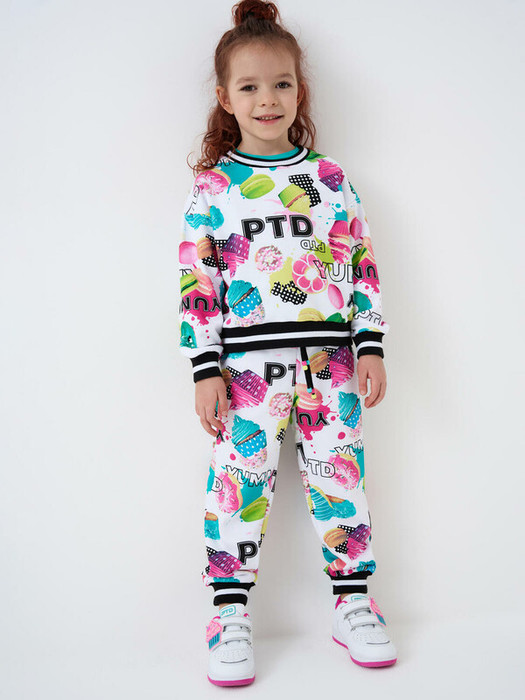 Детский спортивный костюм для девочки. Комплект выполнен из хлопкового футера и состоит из свитшота и джогеров на резинке. Красочный принт с донатами, капкейками и макарунами. Толстовка прямого кроя. Манжеты и пояс выполнены из эластичного риба, благодаря чему изделие хорошо держит форму. Брюки джоггеры — комфортные, с эластичным поясом и шнуром для регулировки посадки. Удобные боковые карманы. Низ штанин собран на резинку.