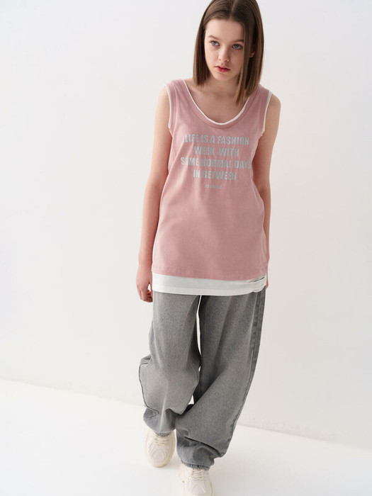 Майка для девочки подростка. Модель прямого силуэта, без рукавов, с круглой горловиной. Выполнена с эффектом двойного слоя из хлопкового трикотажа джерси. Спереди —  принт. Внизу  — декоративные разрезы.
