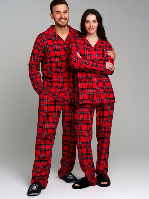 Пижама текстильная взрослых размеров: можно составить family look c детским вариантом пижамы аналогичного дизайна. 100% хлопок. Фланель - мягкая, приятная к телу ткань с небольшим начесом. Застежка на пуговицы. Карманы в брюках. Эластичный пояс с тесьмой позволяет легко надевать брюки и утягивать до комфортной посадки.