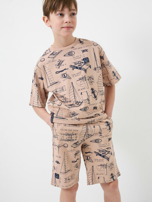 Пижама для мальчика подростка. Комплект состоит из оверсайз футболки с коротким рукавом и шорт. Изделие выполнено из мягкого, хлопкового трикотажа и имеет свободный крой, который обеспечивает комфорт. Принт на ткани — в морской тематике: яхты, схемы. Горловина футболки круглая с эластичной окантовкой, на шортах — удобный пояс с резинкой и завязками, а также карманы в боковых швах.