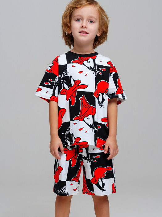 Пижама детская для мальчика. Футболка и шорты из эластичного и приятного на ощупь трикотажа. Шорты на резинке со шнурком. Высокое содержание хлопка 95%. Благодаря наличию эластана в составе ткани изделие держит форму и меньше мнется.