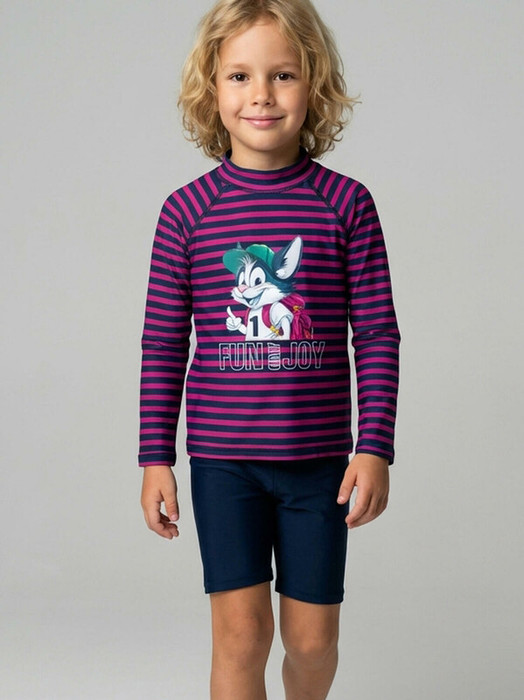 Детский плавательный комплект из лонгслива и шорт для мальчика. Верх — с длинными рукавами, высоким воротничком и застёжкой на молнии сзади. На груди — крупный принт. Шорты тёмно-синие, с мягкой резинкой на талии и декоративным шнурком. Все швы сделаны плоскими — для удобства и комфорта в носке. Отличный вариант для активного отдыха или пляжа.