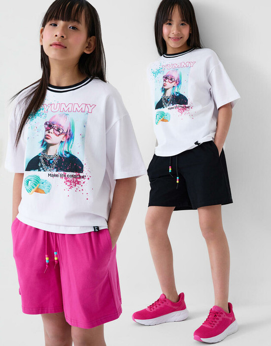 Набор шорт для девочки подростка. В комплект входят две пары шорт свободного кроя. Модели из мягкого, хлопкового трикотажа джерси. Удобная посадка обеспечивается эластичным поясом со шнуром. По бокам расположены два кармана.