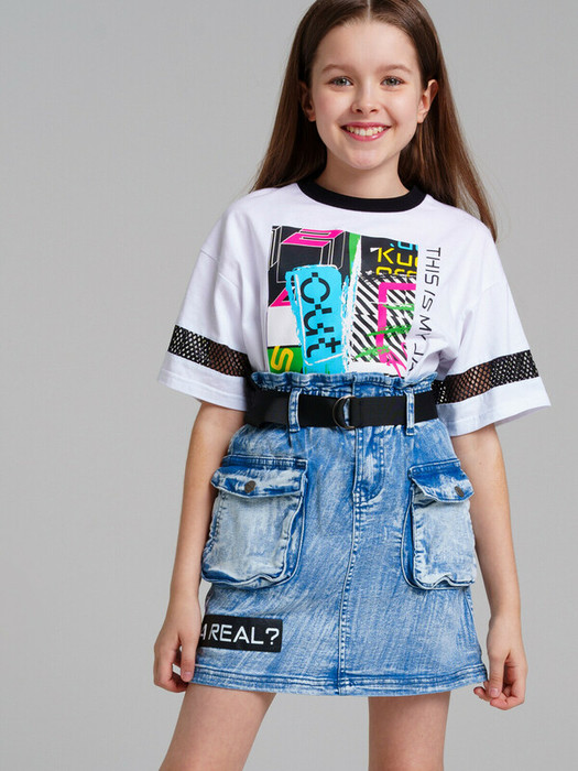 Юбка джинсовая для девочки. Застежка на джинсовую пуговицу. Внутренняя утяжка на талии и с декоративный пояс. Функциональные накладные карманы.