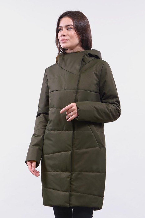 Стильное полупальто, выполненное из нового вида ткани с матовой поверхностью в оригинальных цветах. Застежка на молнию с кнопками, высокий утеплённый воротник, переходящий в большой капюшон. В модели использована модная трапецивидная стёжка. Силуэт прямой, зауженный к низу, линия низа фигурная. Удобные прорезные карманы с листочкой. Длина пальто по спинке ок. 92 см, по переду ок. 89 см. Длина рукава ок.65 см. Рост 170 см Р-ры 42-52 Состав: полиэстер 100% Утеплитель:  Air Twin Light 100 г/m 2 Цвет :защитный Цвет одежды может незначительно отличаться от оригинала.