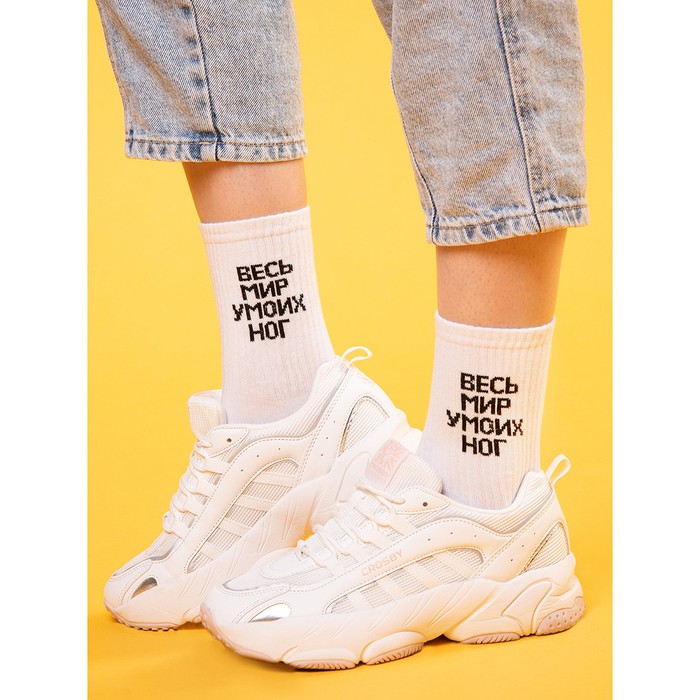Белые женские носки с надписью Весь мир у моих ног — стильная база, которая легко впишется в повседневный образ и точно поднимет настроение!