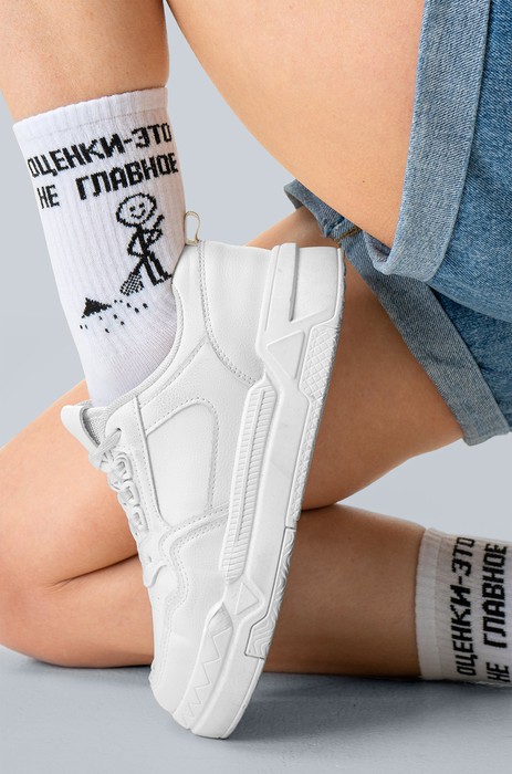 Белые женские носки с надписью Оценки — это не главное — стильная база, которая легко впишется в повседневный образ и точно поднимет настроение!