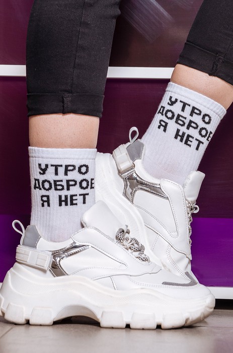 Белые носки выполнены из натурального хлопка и украшены прикольной надписью. Благодаря широкому размерному ряду они отлично подходят женщинам, мужчинам и подросткам.