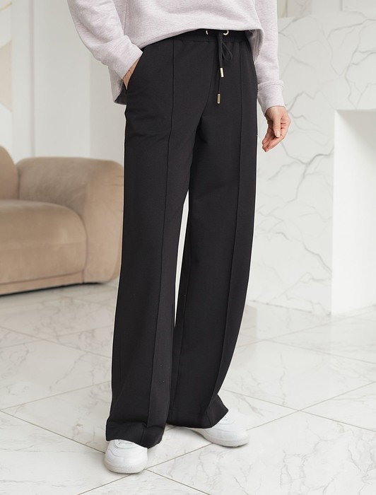 Состав: 95%Хлопок 5%ПУ Плотность: 240 Г/м2Брюки черного цвета прямого кроя выполнены из премиального футера-двухнитки. Лаконичный силуэт поддерживают застроченные стрелки, зрительно вытягивающие силуэт. Удобный пояс на резинке регулируется хлопковым шнурком с золотистой фурнитурой. Наличие эластана в составе изделия гарантирует комфорт и долговечность изделия. Эластичный материал хорошо пропускает воздух, позволяя телу дышать, и легко тянется, не ограничивая движения.