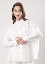 Блуза прямого кроя, длиной до середины линии бедер. Воротник стойка. Перед изделия декорирован кружевом и бахромой.Объемные рукава на резинке-венгерке с широкими манжетами.Классическая модель, которая подойдет и для рабочих образов, и для неофициальных встреч.