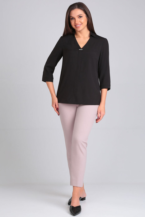 Блузка женская полуприлегающего силуэта из легкой струящейся ткани. По переду нагрудные вытачки и односторонняя застрочная складка по центру. V-образный вырез. Воротник стояче-отложной с отрезной стойкой. Рукав втачной, длиной 3/4, по низу рукава узкая манжета с нахлестом. В верхней части складки переда пришит металлический логотип.