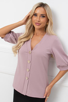Женственная блуза свободного кроя из трикотажного полотна.V - образный вырез переходящий в планку с застежкой на петли и пуговицы. Втачной короткий рукав, оканчивается притачной манжетой на сборке. Низ ровный, без разрезов.