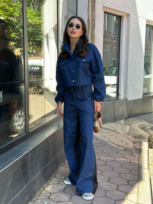 Брюки свободного кроя выполнены из плотного деним. Застёжка - гульфик на молнии. По бокам обработаны лампасы из чёрного денима. Линия талии завышена