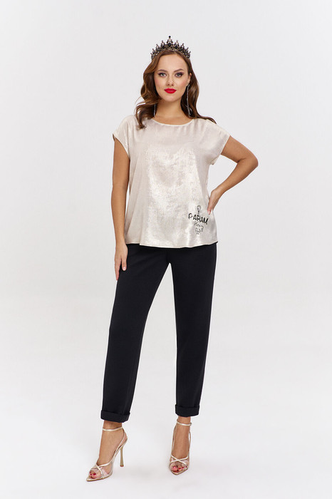 Джоггеры из  трикотажа "дюпон", силуэтной формы "бананы", с карманами спереди и фигурной кокеткой сзади. Пояс с резинкой. В  боковых швах  лампасы с перламутровым принтом.