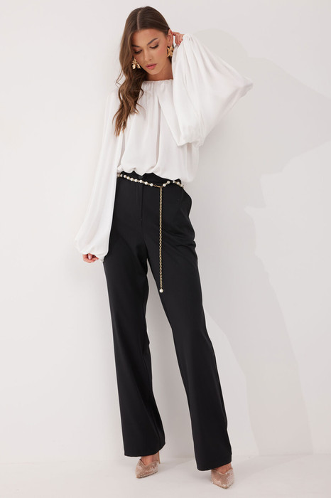 Брюки слегка зауженные на уровне колена и расширенные книзу из костюмной ткани. По верху брюк притачной пояс с застежкой на петлю и пуговицу и шлевками для ремня. На передних половинках обработаны наклонные карманы и застежка молния в среднем шве. С 50 по 60 размер в брюки на поясе вставлена эластичная тесьма (резинка). На задних половинках вытачки. Ремень в комплект не входит.