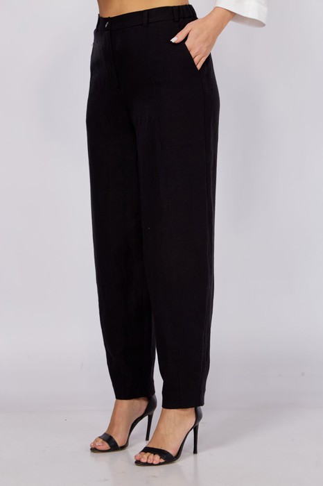 Брюки женские.Спереди застёжка на молнию и пуговицу.Сзади вытачки. В боковых швах карманы с отрезным бочком.Пояс по спинке на резинке , дополнен шлёвками.По низу брюк вытачки, создающие зауженный эффект.