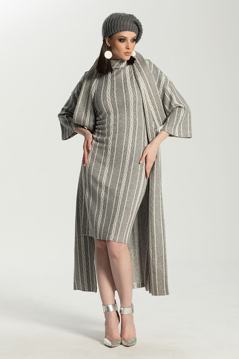 Кардиган на поясе, с отложным воротником. По бокам разрезы. Рукав кардигана 3/4. Без подкладки.