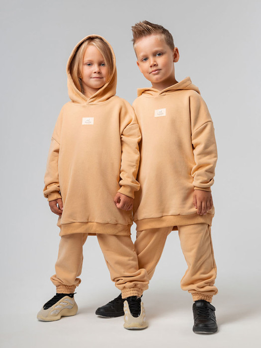 Костюм детский. Толстовка свободный покрой, несъемный капюшон, рукава на манжетах. Брюки- джоггеры, детали: пояс - эластичная резинка, низ изделия- манжеты. Состав: футер трехнитка петля фрча 80% хлопок 20% полиэстер.