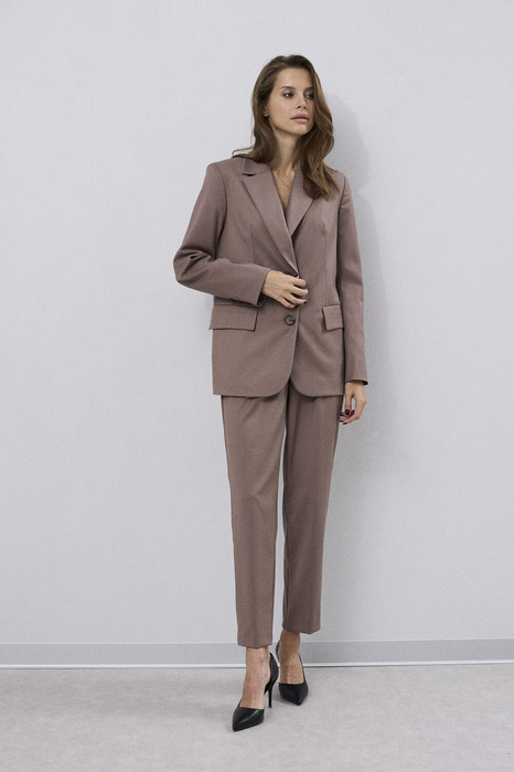 Костюм женский двухпредметный , полуприлегающего силуэта ,выполненный из костюмного однотона высокого качества . Жакет с однобортной застежкой , рукав втачной двухшовный с декоративной шлицей снизу . Воротник стояче - отложной с отворотами лацканов . По переду жакета также функциональные карманы с клапанами . Жакет на подкладке. Брюки слегка заужены к низу , верх брюк обработан притачным поясом , по спинке пояса - резинка . В верхней части брюк расположены карманы .