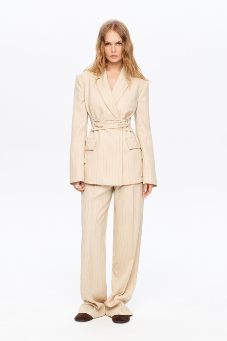 Костюм-двойка из жакета со шнуровкой с расширенной линией плеч и широких прямых брюк со стрелками из текстильной ткани в полоску.