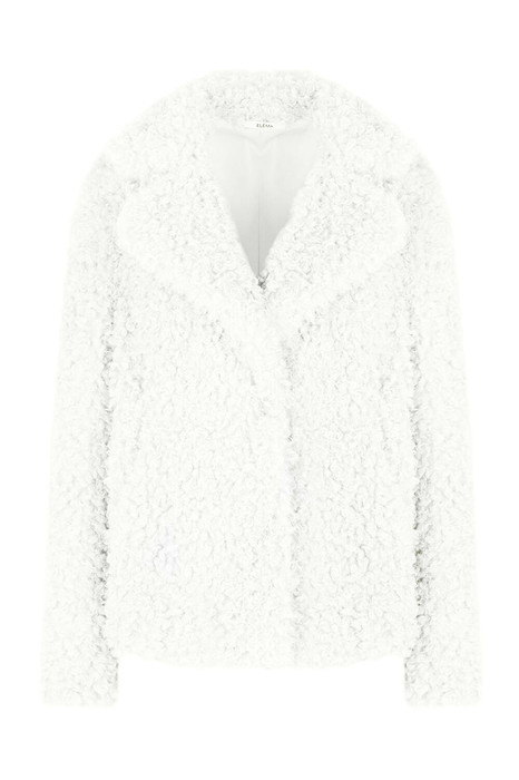 Пальто женское демисезонное, из мехового трикотажного полотна, на подкладке, однобортное, прямого силуэта длиной до середины бедра. Застежка на пришивные кнопки. Перед с функциональными карманами «щель». Рукав длинный, одношовный. Воротник и лацкана отложные.